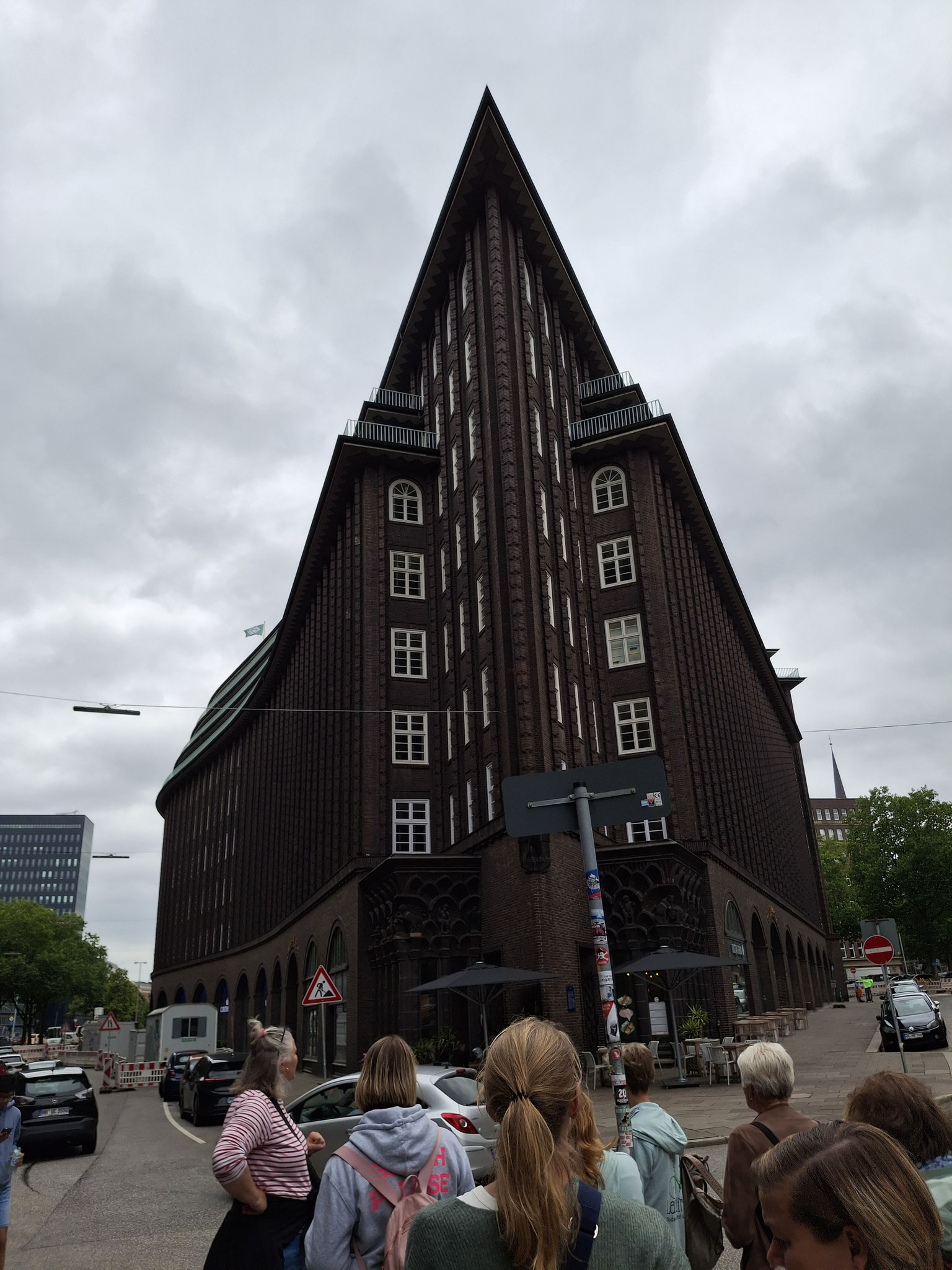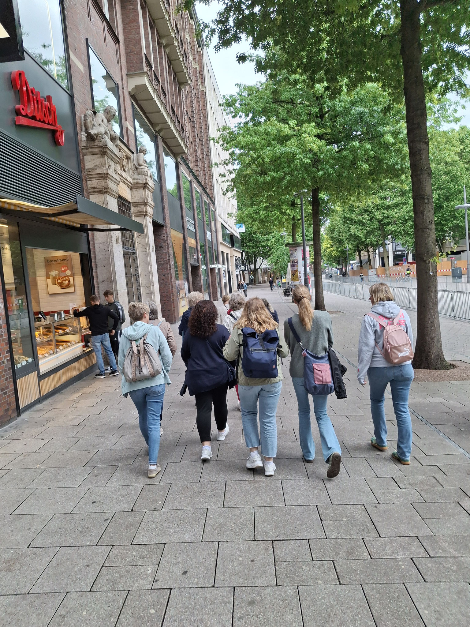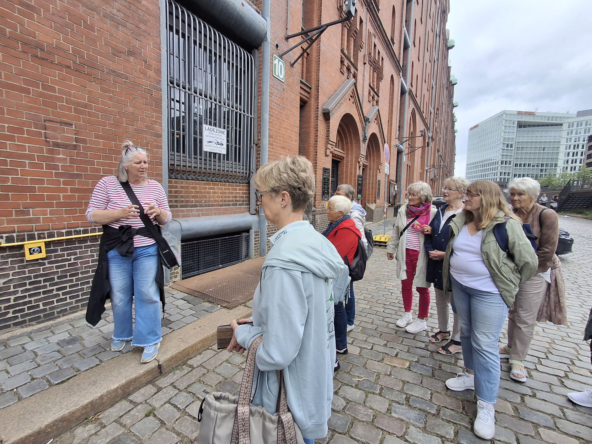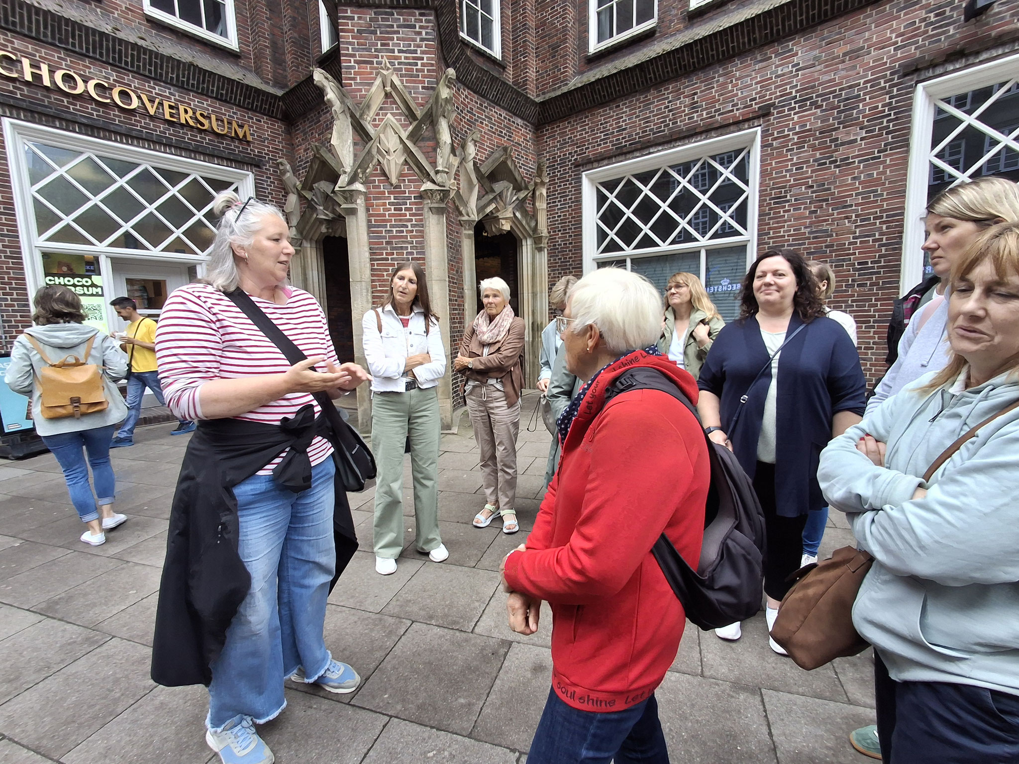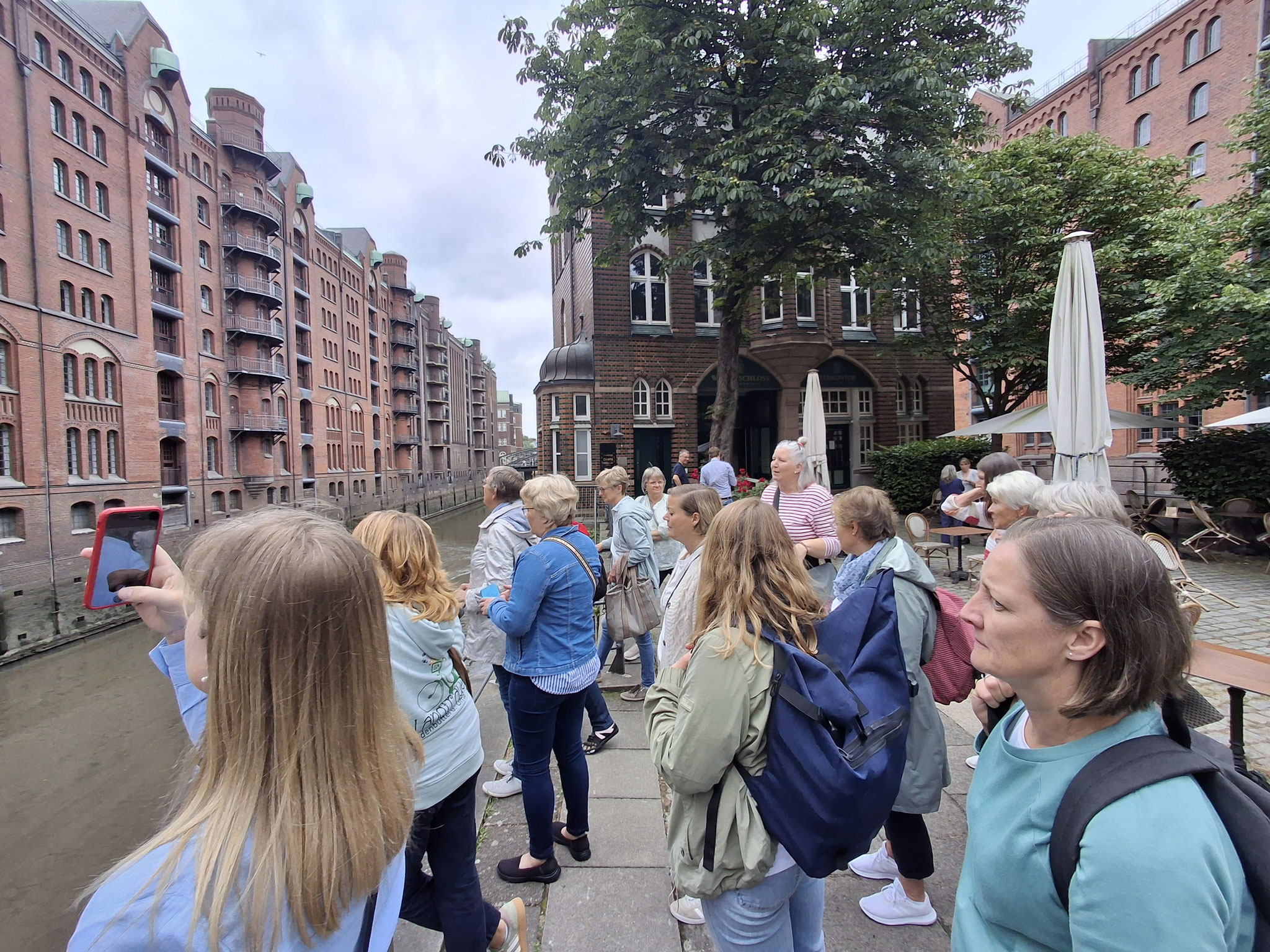 Am 12. Juli unternahmen wir einen aufregenden Ausflug nach Hamburg. Die frühe Zugfahrt verlief reibungslos. Nach unserer Ankunft gingen wir entlang der Mönckebergstraße zum Schanzenbäcker, um uns dort mit einem Frühstück zu stärken. Dann ging es weiter durch die noch sehr ruhige Stadt zum Chocoversum. Von dort sollte die Speicherstadtführung losgehen. Wir trafen eine Dame von den Rosinenfischern, die mit uns losmarschierte. Sie erklärte uns, dass die Speicherstadt Ende des 19. Jahrhunderts erbaut wurde und seit 2015 endlich zum UNESCO-Weltkulturerbe gehört. Ursprünglich war es ein Lagerhauskomplex für wertvolle Importware wie Kaffee, Tee, Kakao, Gewürze und Teppiche. Besonders beeindruckend ist die Architektur: Die Gebäude bestehen meist aus roten Backsteinen und neugotischen Fassaden und stehen auf Eichenpfählen. Wir erfuhren viel über die Historie und die Rolle der Speicherstadt für Hamburgs Handelsgeschichte. Zwischendurch gab es immer kleine Schokoladenproben zum Thema. Die Führung endete wieder am Messberg 1, im Chocoversum.